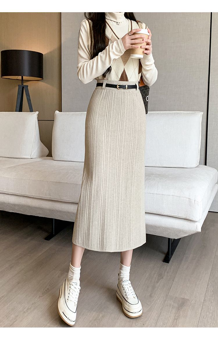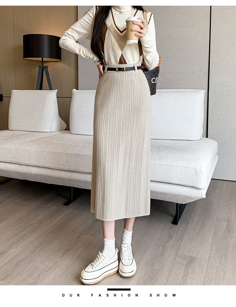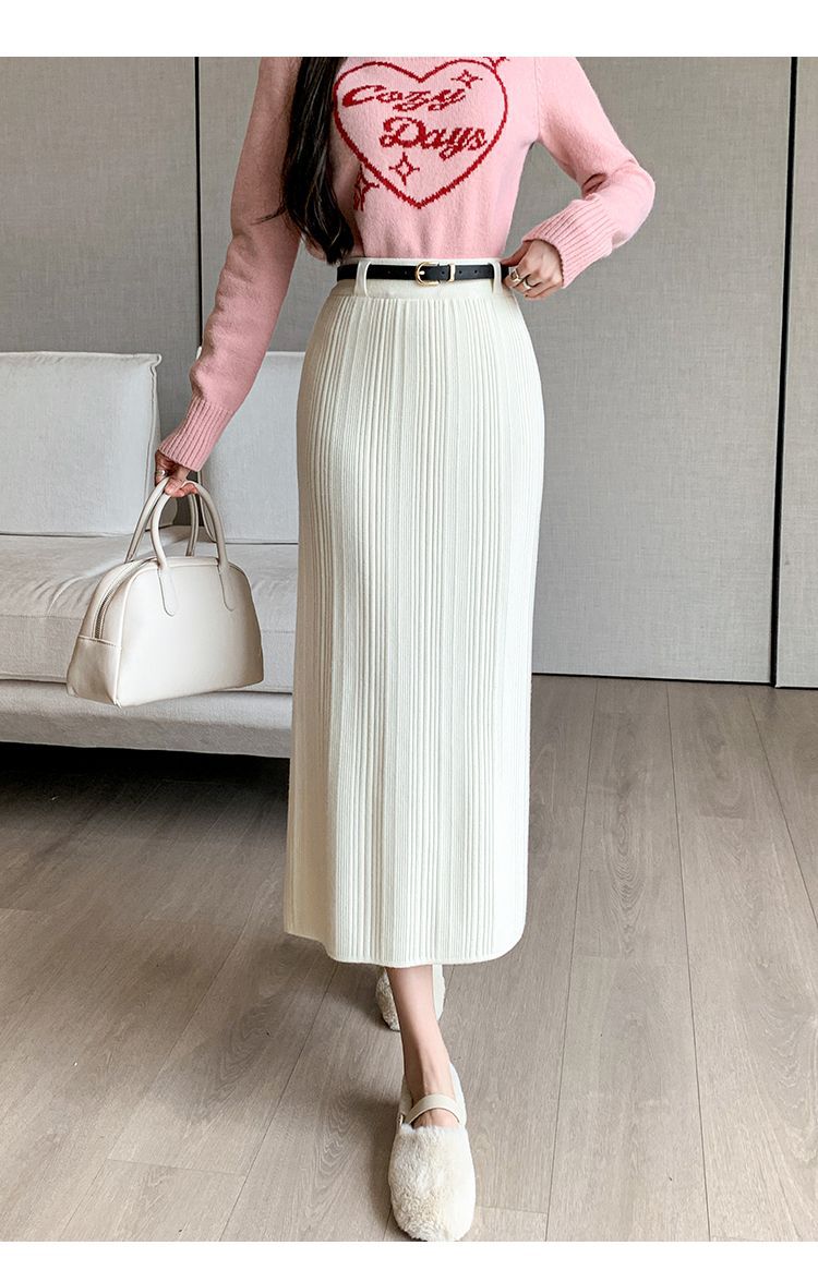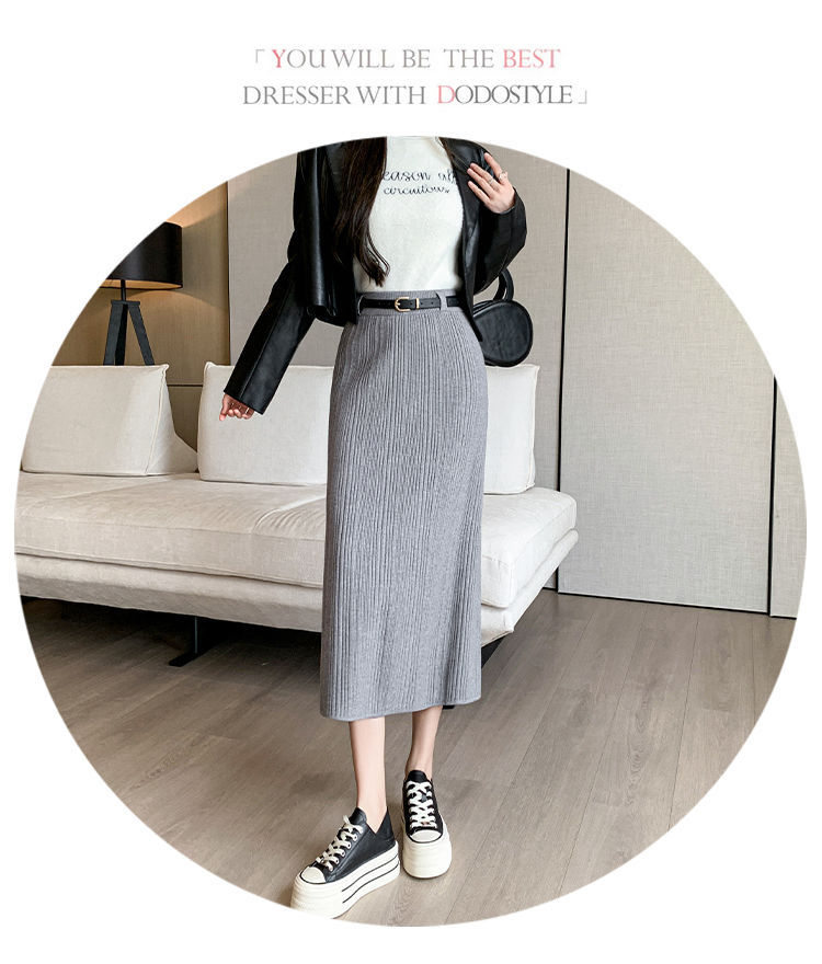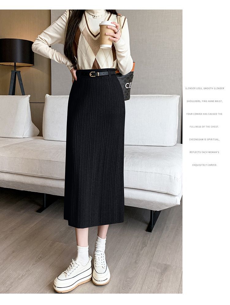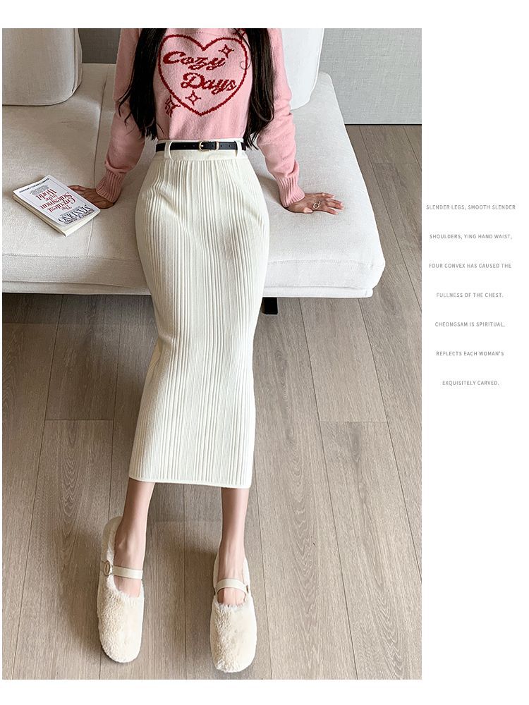Knitted Sheath Straight Skirt with French Stripe Slit