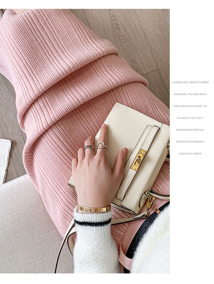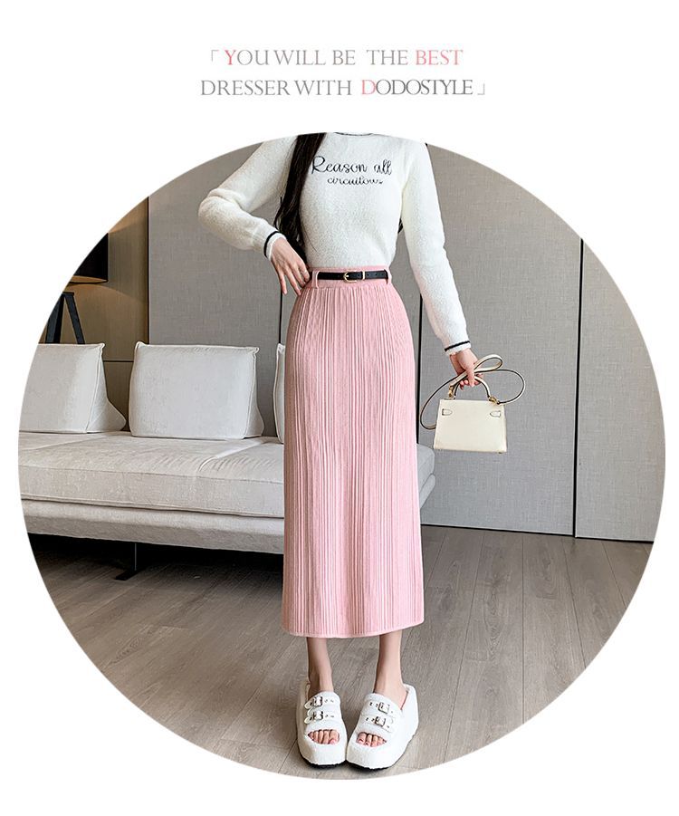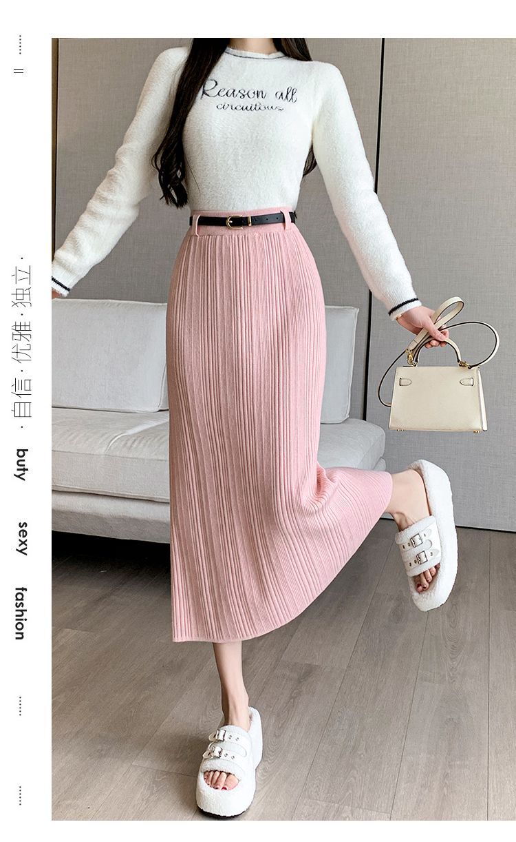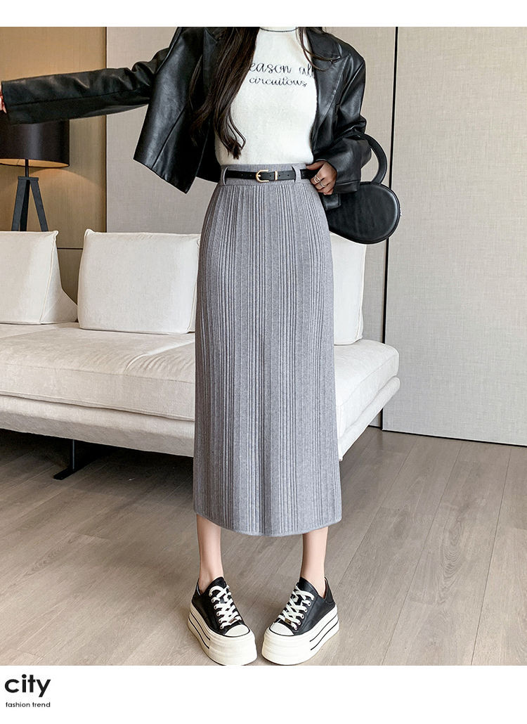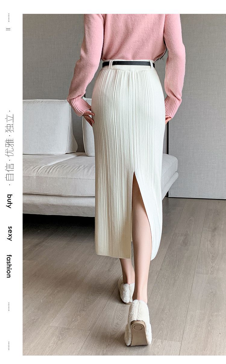 Knitted Sheath Straight Skirt with French Stripe Slit